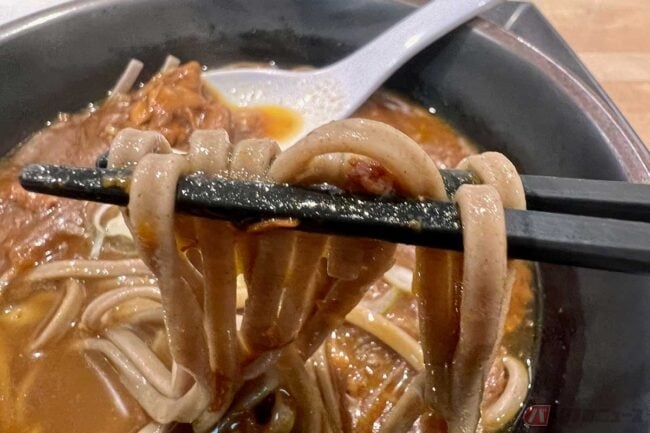 首都高速道路「市川PA」のフードコートではハズレを引いたことがなく、「カレーそば」(700円)にも自然と期待が高まります。カレーとそばの組み合わせは、じつは奥深い世界。その完成度に注目しながらいただきました。