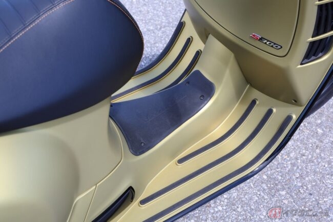 多くのスクーターは、スチールパイプを主骨格とし、そこに樹脂の外装をかぶせることでボディを形作るのが一般的です。一方のベスパは、ボディ全体がスチールのプレス材から成り、骨格そのものが外装としての機能を両立。ステップボードやフェンダーに触れた時に発する「カンカン」という金属音のイメージそのままに、まったく遊びのないダイレクトなレスポンスで、車体の鼻先はキビキビと向きを変えます。