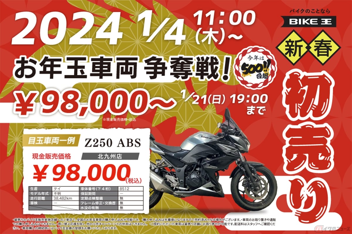 イチオシの目玉車両としては、北九州店(福岡県)で販売されるカワサキ「Z250 ABS」(走行距離3万8482km)が、なんと9万8000円(税込み販売現金価格)という驚きの価格設定に! この他にも全国で500台以上の「お年玉車両」が用意され、さらにその中から各店舗1台ずつ「24万円特選車」が設定されます。