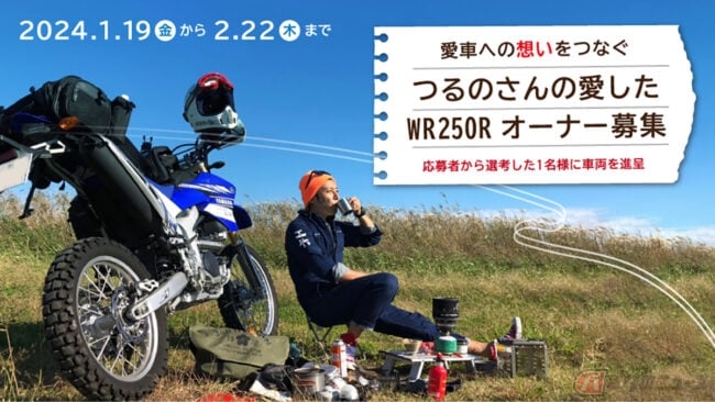 「愛車への想いをつなぐ つるのさんの愛したWR250Rオーナー募集」と題し、2024年1月19日(金)から2月22日(木)までWEB上のエントリーフォームから応募することで、1名につるのさんの「WR250R」が引き継がれる企画が始まっています。