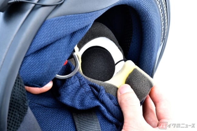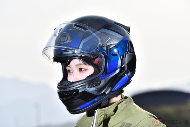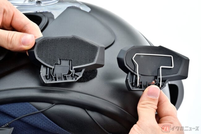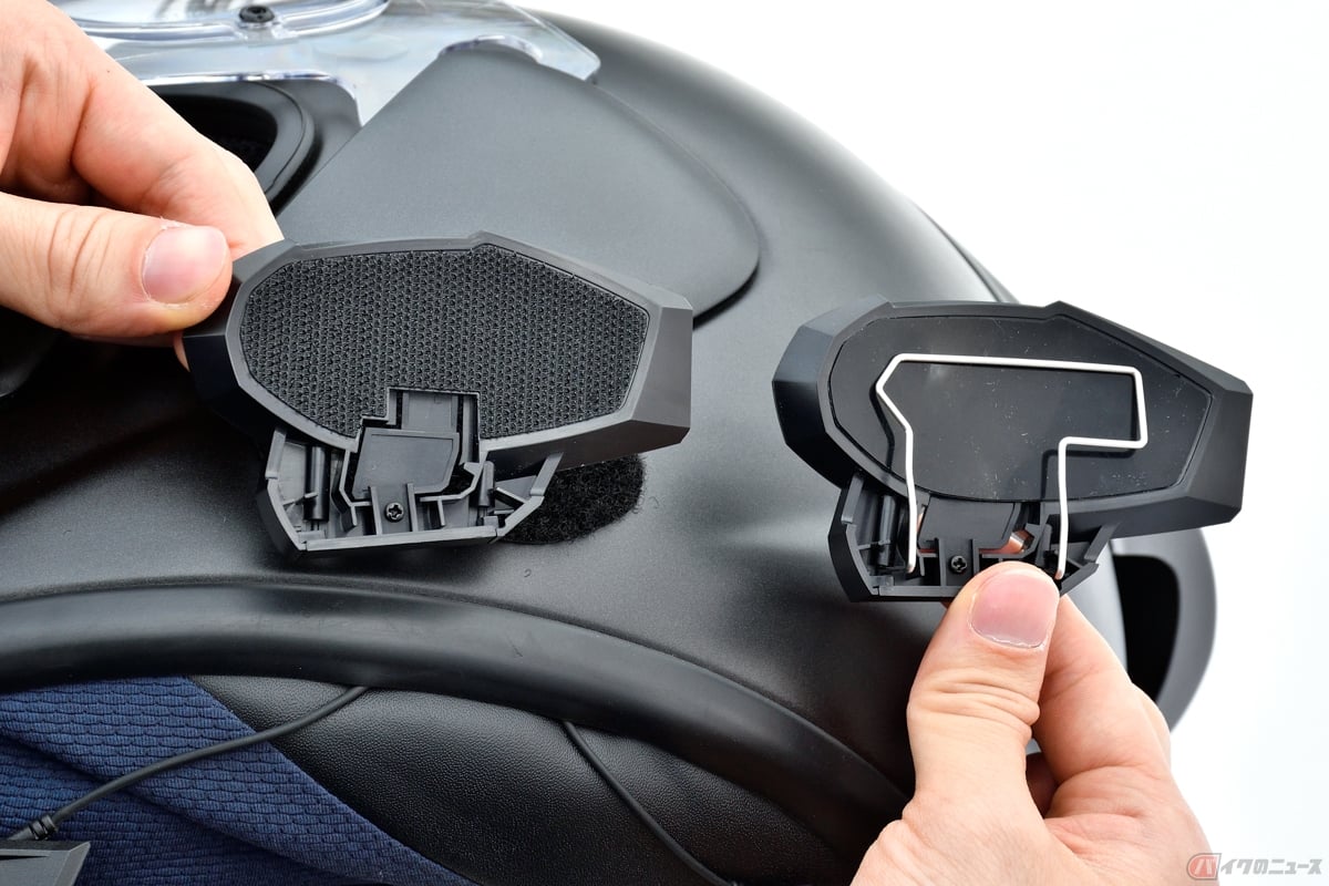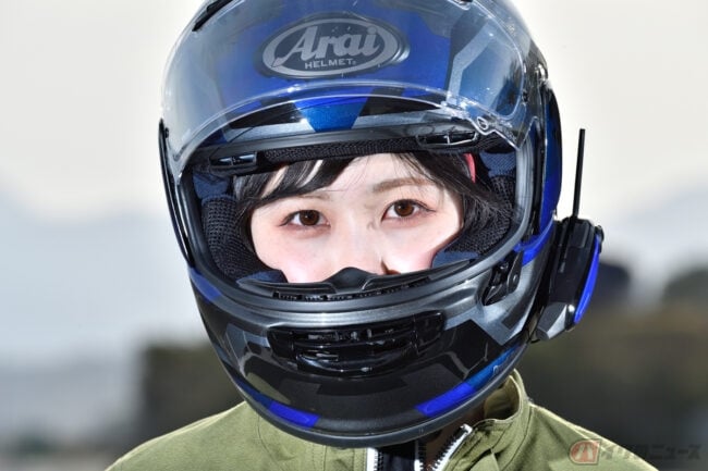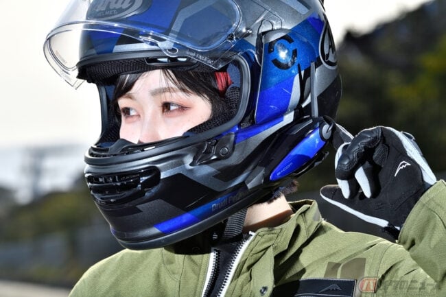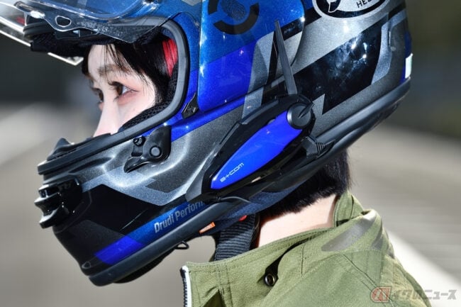 ちなみに今回は、オプションパーツでカラーやグラフィックを変更できる「フェイスプレート(税込み1980円)」でカスタムしちゃいましたぁ! 私の愛用しているアライのヘルメット「アストロGX」のカラーとピッタリ! ヘルメットに装着すると一体感がバッチリです。取り付けもワンタッチで簡単…! インカムも着せ替える時代なのね♡