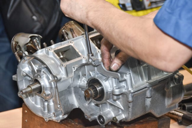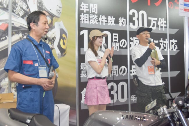 さらに貴重な車両の展示にとどまらず、バイク王公式アンバサダーでバイク女子タレントの朝山すずさんと、バイクラジオパーソナリティーのステップ堀田氏をMCに迎えた整備教室も開催されました。整備の実演や指導役を務めるのは、実際にバイク王で勤務する整備スタッフたちです。