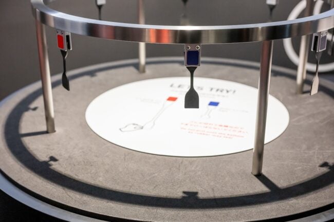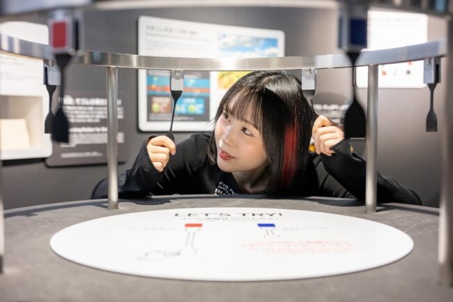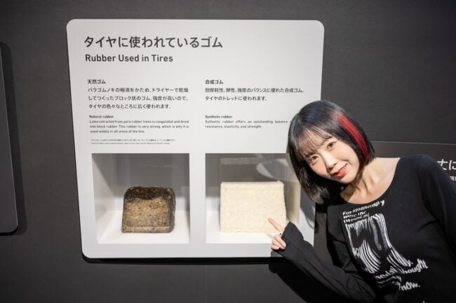 「WHAT WE OFFER ~モビリティ社会を支える~」では、タイヤの製造方法やタイヤの種類、またゴムの役割など、多くの学びが得られます。さらにちょっとした実験コーナーのような展示もあり、バイクやクルマに興味を持ち始めたお子さんも楽しめそうです。ちなみに、夜道さんも実験に夢中になっていましたよ(笑)。