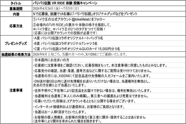 開催期間は2026年4月24日(金)から2026年7月5日(日)までで、バイク王のX公式アカウント(@bikelifelab)をフォローして、会場内でVR体験や展示の様子を撮影。体験によって高まった感情を一言で表現、ハッシュタグ「#バイク愛と」を付けてXへ投稿して応募完了です!