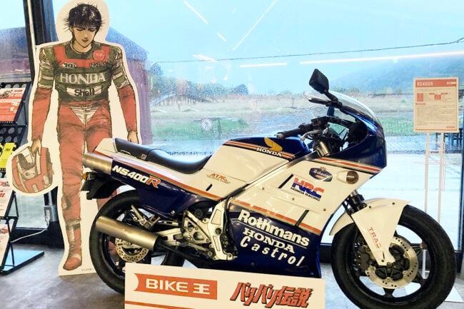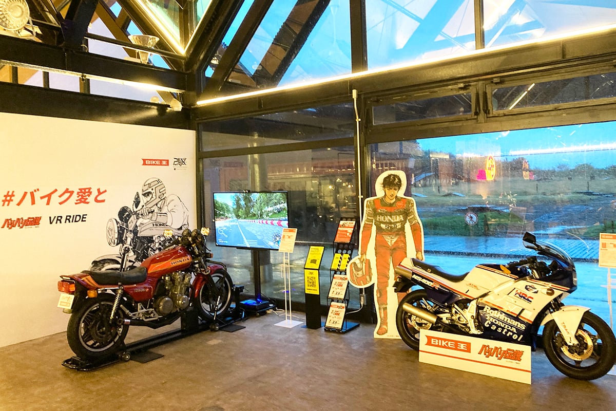 そんなツーリングライダーの聖地、バイカーズパラダイス南箱根のオープン7周年を記念する企画展が、4月24日に始まりました。そこではバイクが登場する漫画作品やアーティストによる個展が開かれ、その中の「バリバリ伝説」ブースにて、バイク王による巨摩 郡(こま ぐん)の愛車を再現した車両展示と、その車両をVRによって走行体験ができる企画を開催しています!