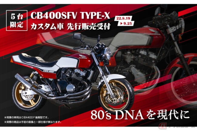 いまだ人気の衰えない絶版車であるホンダ「CBX400F」のスタイルを再現した、ドレミコレクションの「CB400SF TYPE-X」でカスタムを施したCB400SFVを、抽選で5台先行販売します。つるの剛士さん出演の新CMにも登場するそうです。