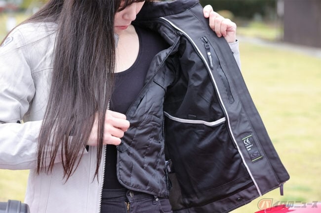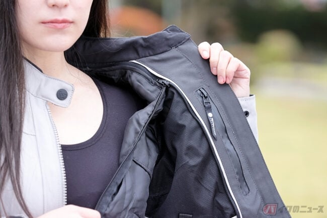 湿度の高いアジア圏の気候に合った高い透湿防水性能により、いつでも快適にライディングを楽しめる着心地の良い設計となっています。保温性の高い着脱式インナーのサーマルライニング加工と防水透湿仕様の防水ポケットを備え、急な土砂降りに見舞われても、体温が奪われるのを抑えつつ、携帯、財布、チケットなど、小物類の水濡れを防いでくれる便利設計となっています。