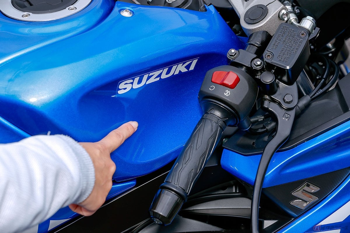 これまで私が乗ってきたセパレートハンドルのバイクは、ハンドルの切れ角が小さいものが多く、小回りやUターンでよく苦戦していました。時には立ちゴケしそうになって、結構なトラウマです。ところがGSX-R125はハンドルが大きく切れ、最大限に切ってもタンクとの間に手のひらひとつ分の余裕がありました。本当に感動です!