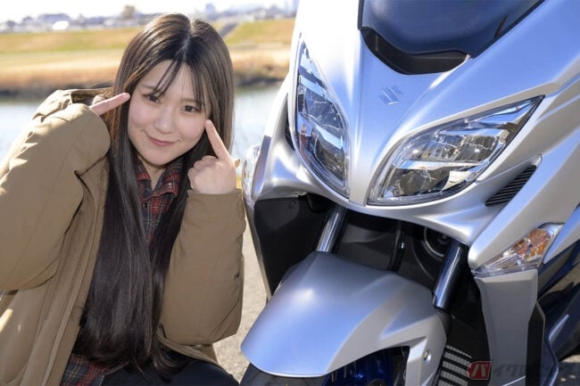 2024.06.28新米メカニックでショーモデルとしても活躍する虹(こう)さんが、人生初のビッグスクーターに挑戦! スズキの400ccラグジュアリースクーター「バーグマン400 ABS」に試乗してみました。