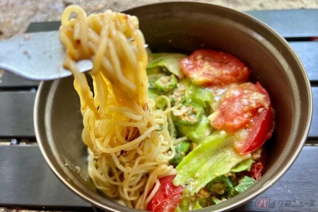 夏野菜たっぷり!! 少ない荷物と食材で作るバイクツーリングの絶品キャンプ飯「トマたまあんかけ焼きそば」に挑戦