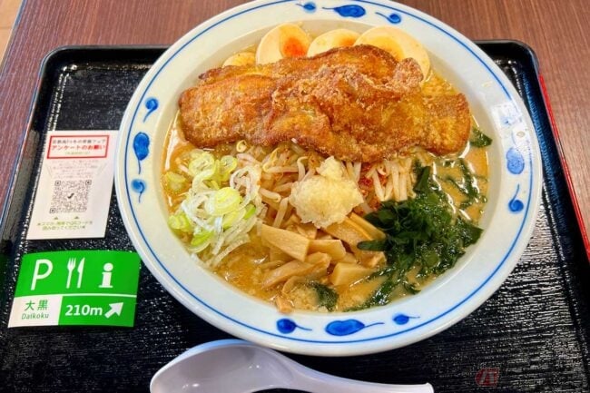 2025.01.22首都高6カ所のPAで、期間限定で開催されている「冬の背徳フェア」(2024年12月1日~2025年2月28日)をご存知でしょうか? 期間中はカロリーたっぷり、背徳感たっぷりの罪深きPA飯を堪能できます。「大黒PA」のオリジナルメニューは、味噌ラーメンに大きなパイコーが2枚入ったものでした。