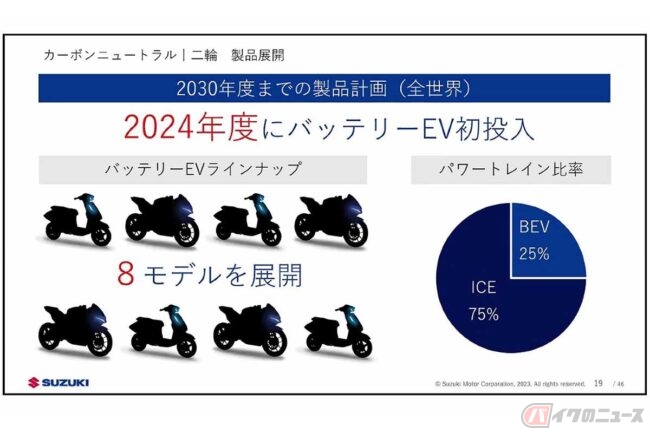 スズキの取り組み 2024年バッテリーEVを初投入 2030年は4台に1台が電動バイク 国内市場には言及せず