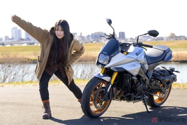 バイク女子が挑む伝説の名車!! スズキ「KATANA」の鋭い切れ味に「怖いけど楽しい!」158cmライダーでも乗りこなせる理由 〜高梨はづきのきおくきろく。〜