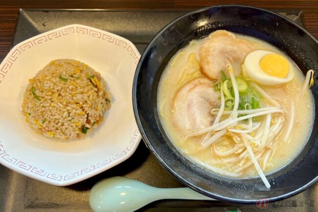 2023.03.08新名神高速道路をバイクで移動中、忍者の里として知られる滋賀県甲賀市甲南町にある「甲南PA」(下り)に立ち寄ったところ、濃厚スープのラーメンを発見。さっそく炒飯とのセットをオーダーしてみました。