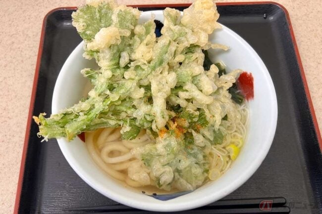 関西風の優しい白出汁が染みる!! 「小田原PA」で味わう季節限定「春菊天うどん」 バイクで行く高速道路グルメ