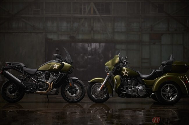 2022.06.26ハーレーダビッドソンは、Pan America 1250 Special(パン・アメリカ1250スペシャル)とTri Glide Ultra(トライグライド・ウルトラ)をベースにした特別仕様車「G.I. Enthusiast Collection」を発表しました。同モデルでは軍用として用いられていた車両「WLA」をモチーフにしたカラーリングが採用されています。