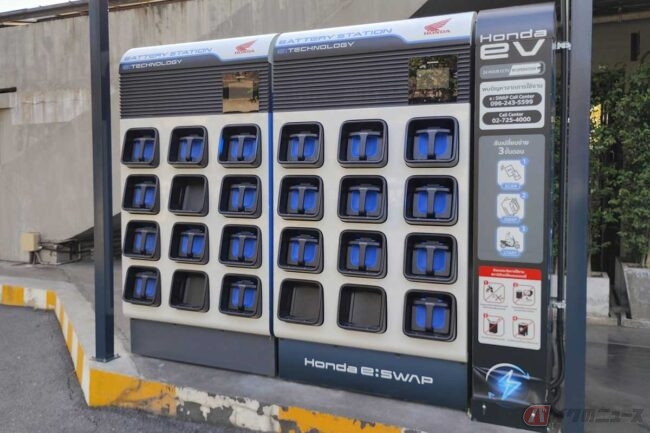 タイ・バンコクでホンダの大型バイク販売店「ホンダ・ビッグ・ウイング」訪問 EVスクーターのバッテリー交換ステーションと充電設備も